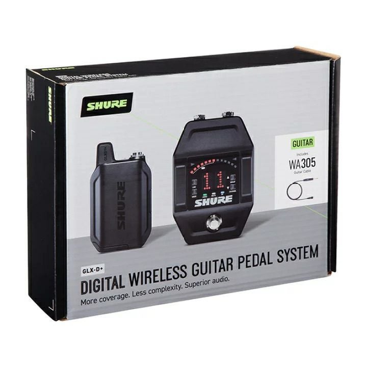 新しいGLX-Dワイヤレスギターペダルシステムには、WA305プレミアムギターケーブル、GLX-D1+ デジタルワイヤレスボディパック型送信機、GLX-D6+デジタルワイヤレス・ギターペダル型受信機が装備されています。