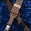 裏側はシートベルトのような滑りの良い素材、表は高級感あふれるレザー。使いやすさとロマンがいい塩梅で共存しております。また、ストラップをギターに付いてるネジを再利用して取り付けることで実質的なストラップロック機能を搭載。詳しくは画像をご覧ください。