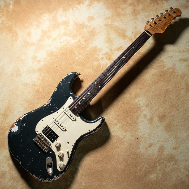今回は当店オーダーのチャコールフロストカラーの1本。SSH配列でモダンなサウンドにも寄せやすい、器用なギターに仕上がりました。エイジドの仕上げはヘビーでオーダー。このオーラがたまりません。