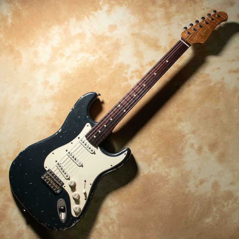 今回は当店オーダーのチャコールフロストカラーの1本。3シングルでヴィンテージスタイルSTにリスペクトを寄せました。エイジドの仕上げはミディアムでオーダー。派手すぎず、リアルなルックスに。