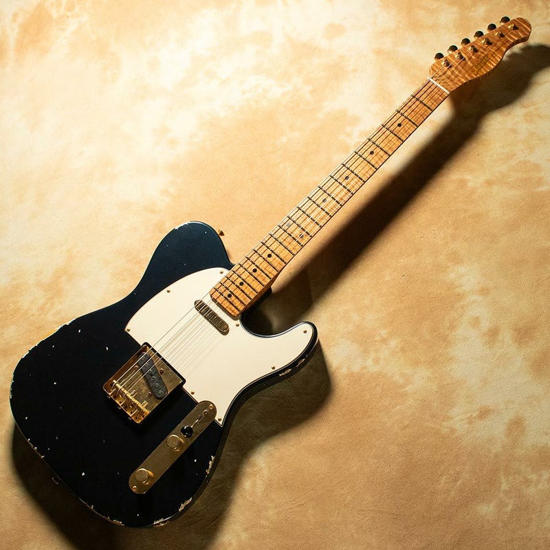 照明の当たり方によって、紺色~黒色の間を行き来するようなカラーリングとゴールドパーツのゴージャスさがいい塩梅です。5Aのローステッドフレイムメイプルでオーダーしているため、ネック裏の杢目も美しい一本です。
