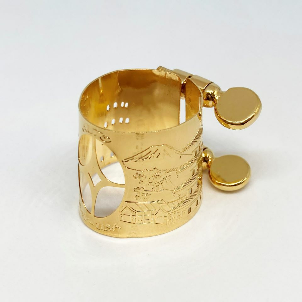 桜に富士山、四重の塔と、日本的なデザイン。金属部分の面積が比較的多く、音の鳴りはやや重厚で音色はダークな傾向のリガチャーです。